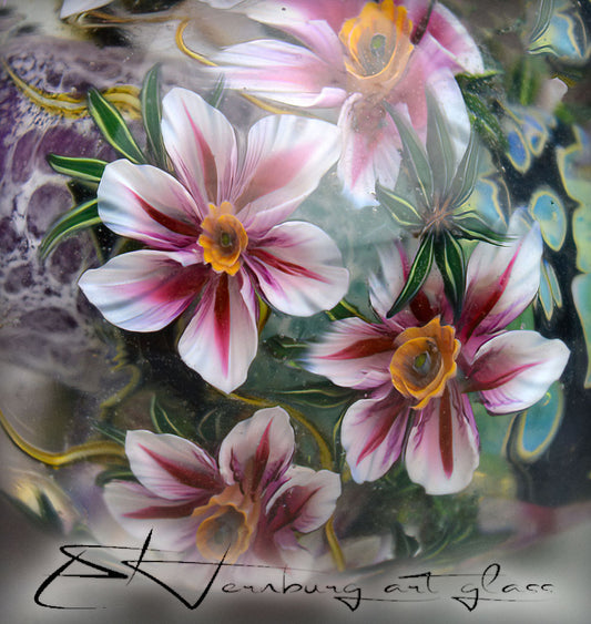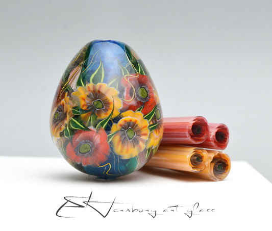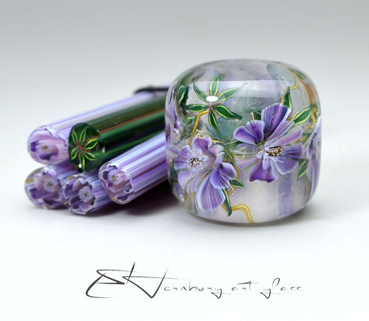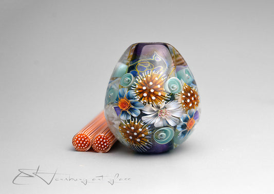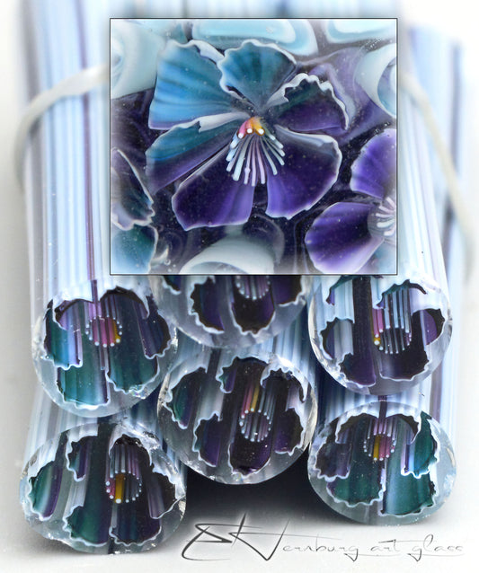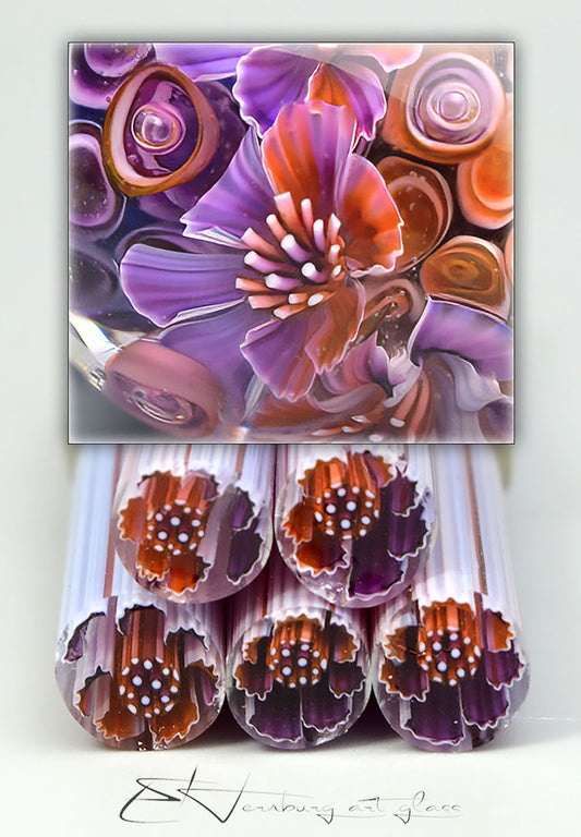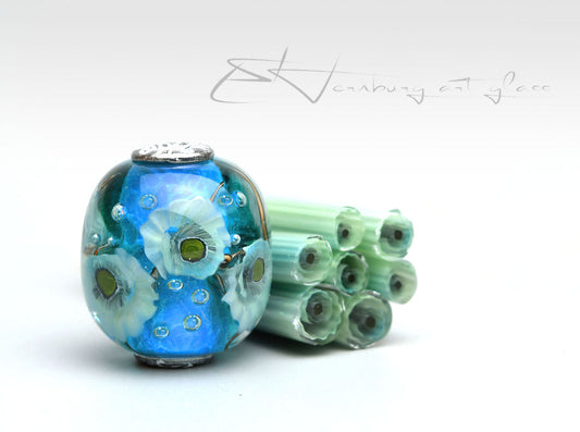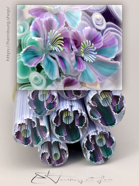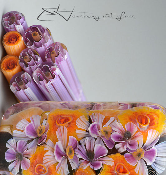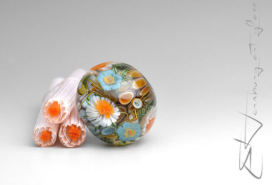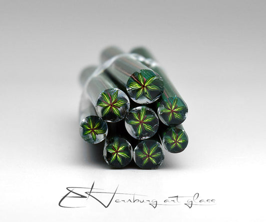 All murrini are handmade by me from COE 104 soft glass. I use proprietary assembling and pulling techniques developed in my studio to achieve exceptional clarity and precision in every pattern.