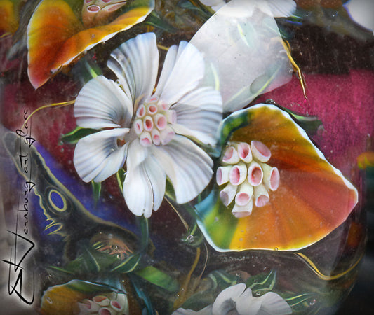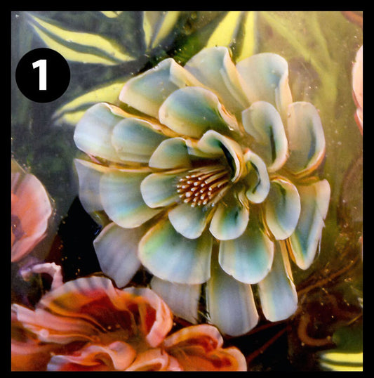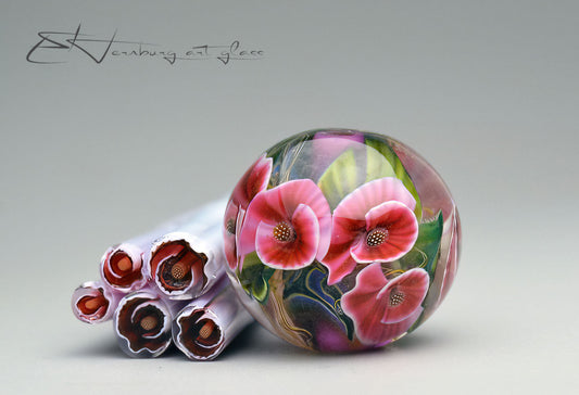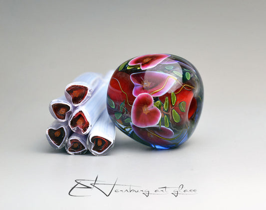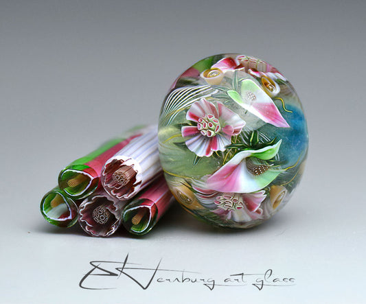 Murrini are miniature glass images captured inside thin rods. Each slice reveals a complete design — a flower, leaf, butterfly, or ornamental motif.
