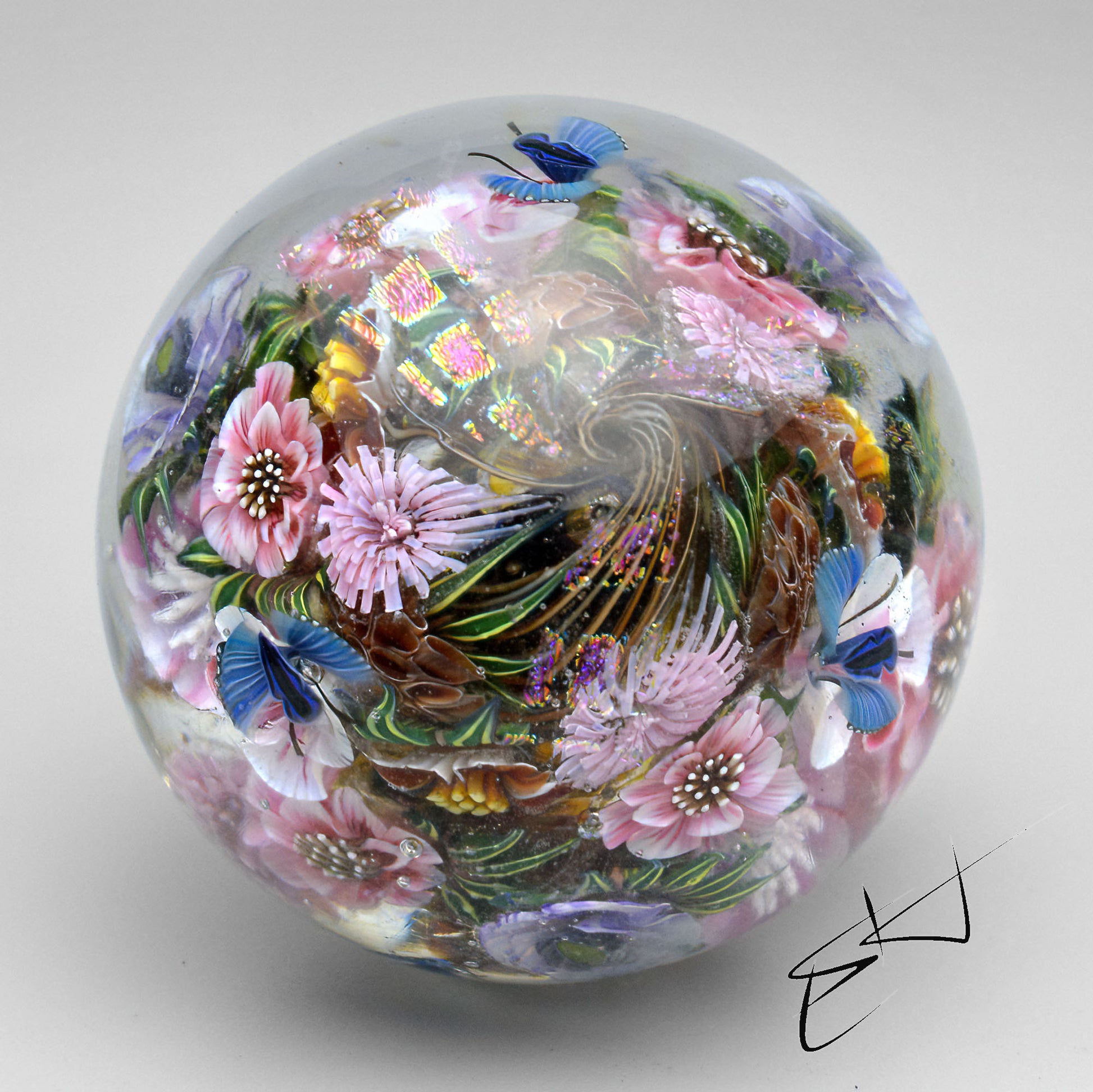This marble feels like a summer morning in a garden full of light and blooming color. Inside, lush pink and lilac flowers intertwine with delicate curls of foliage and flashes of golden light.