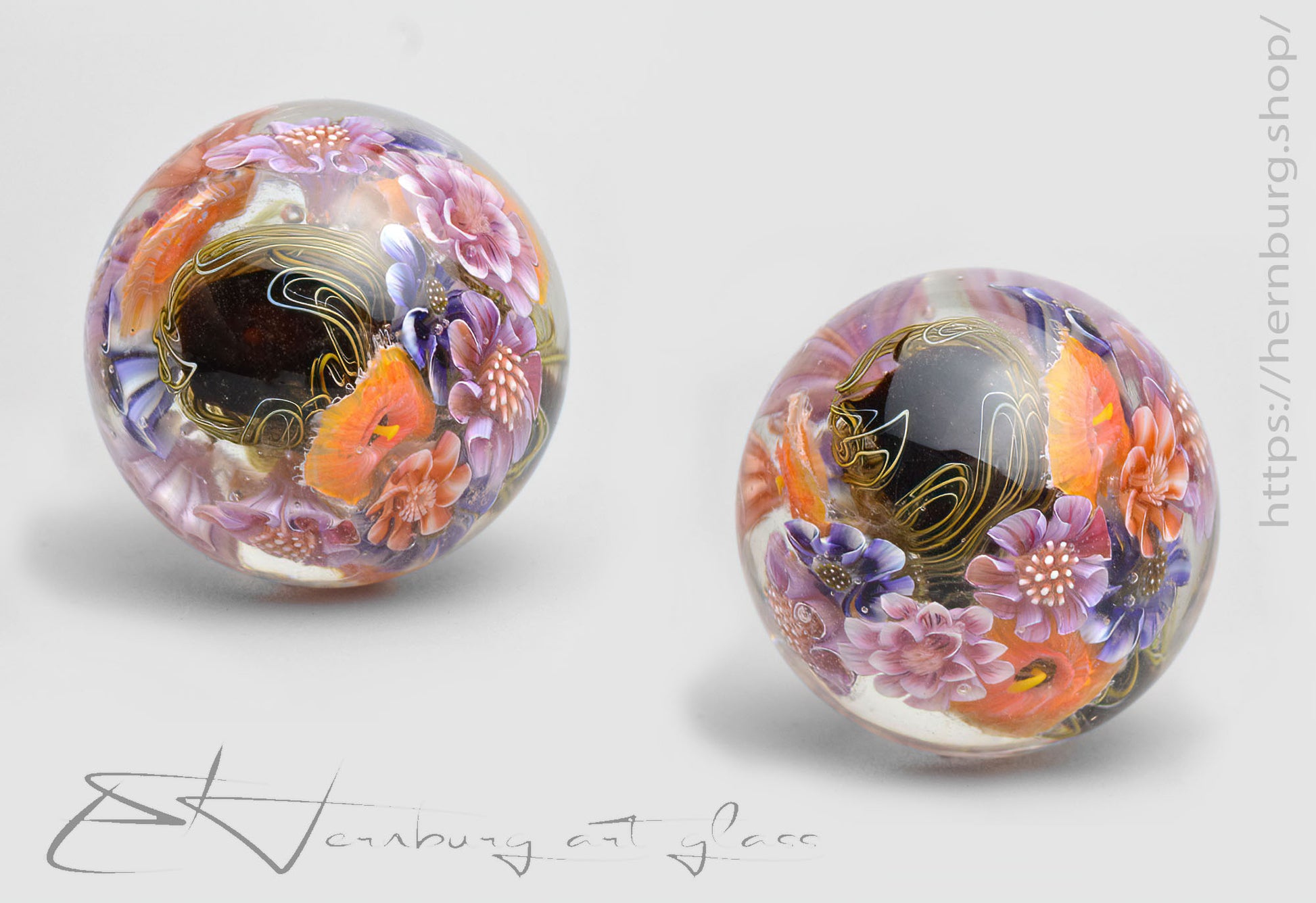 A collector’s glass sphere featuring a three-dimensional floral composition in rich violet, lilac, and vibrant orange tones. Each petal and structural detail is placed with precision, creating clarity, depth, and a balanced sculptural presence inside glass.