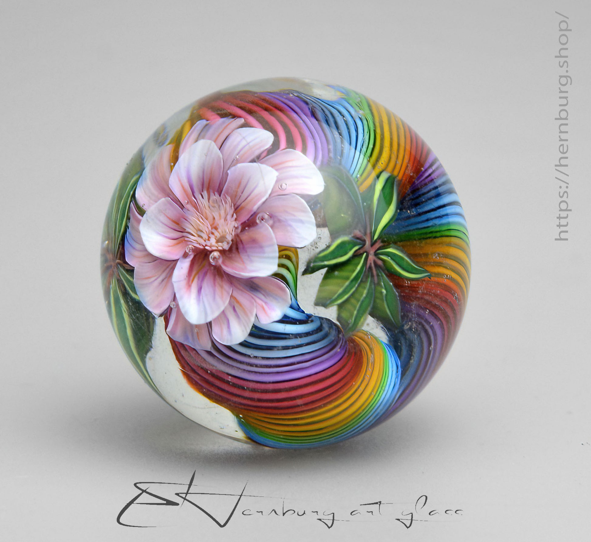 Inside the marble, colorful waves swirl in a gentle spiral around a delicate flower with green leaves. The rainbow lines create a sense of movement and depth, giving the composition balance and vitality.