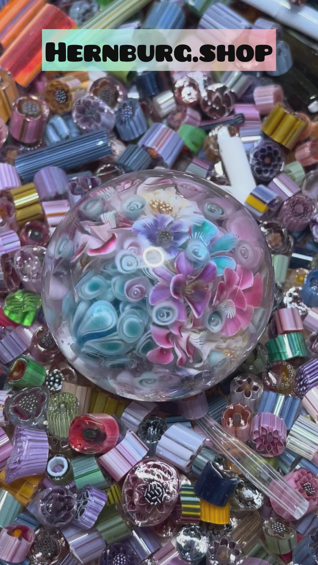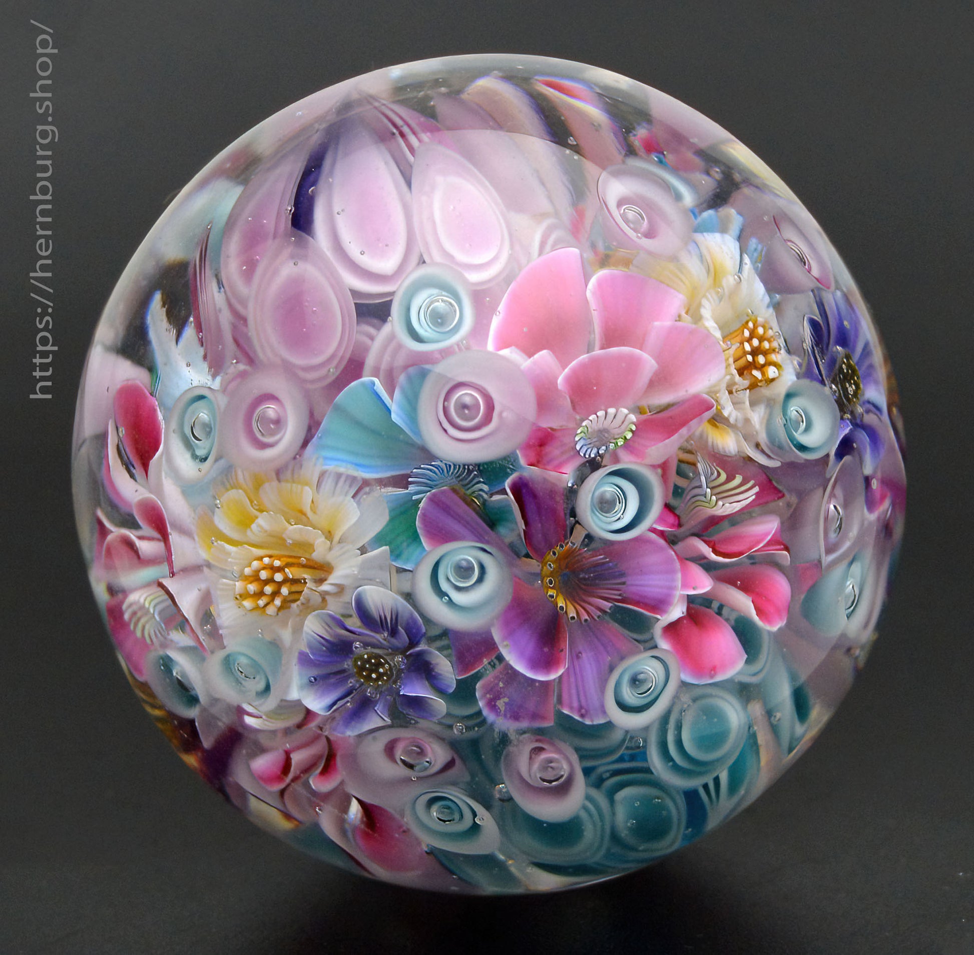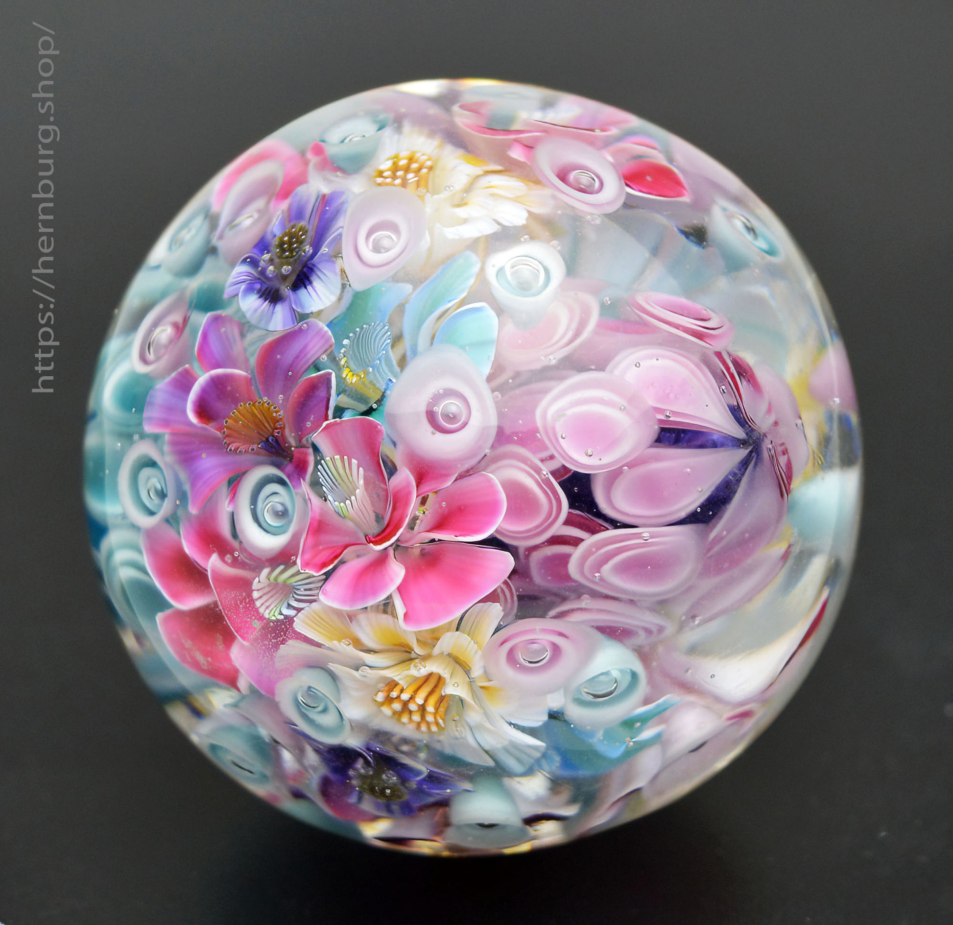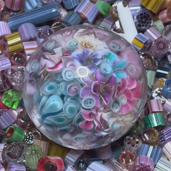 A richly layered floral composition in soft pastel tones. Pink, lilac, blue, and creamy white flowers are interwoven with glass spirals and transparent turquoise elements. Tiny air bubbles are distributed throughout the sphere, creating a subtle shimmering effect and enhancing the sense of depth and visual complexity. As the marble is turned, the pattern continuously shifts while remaining cohesive and balanced.
