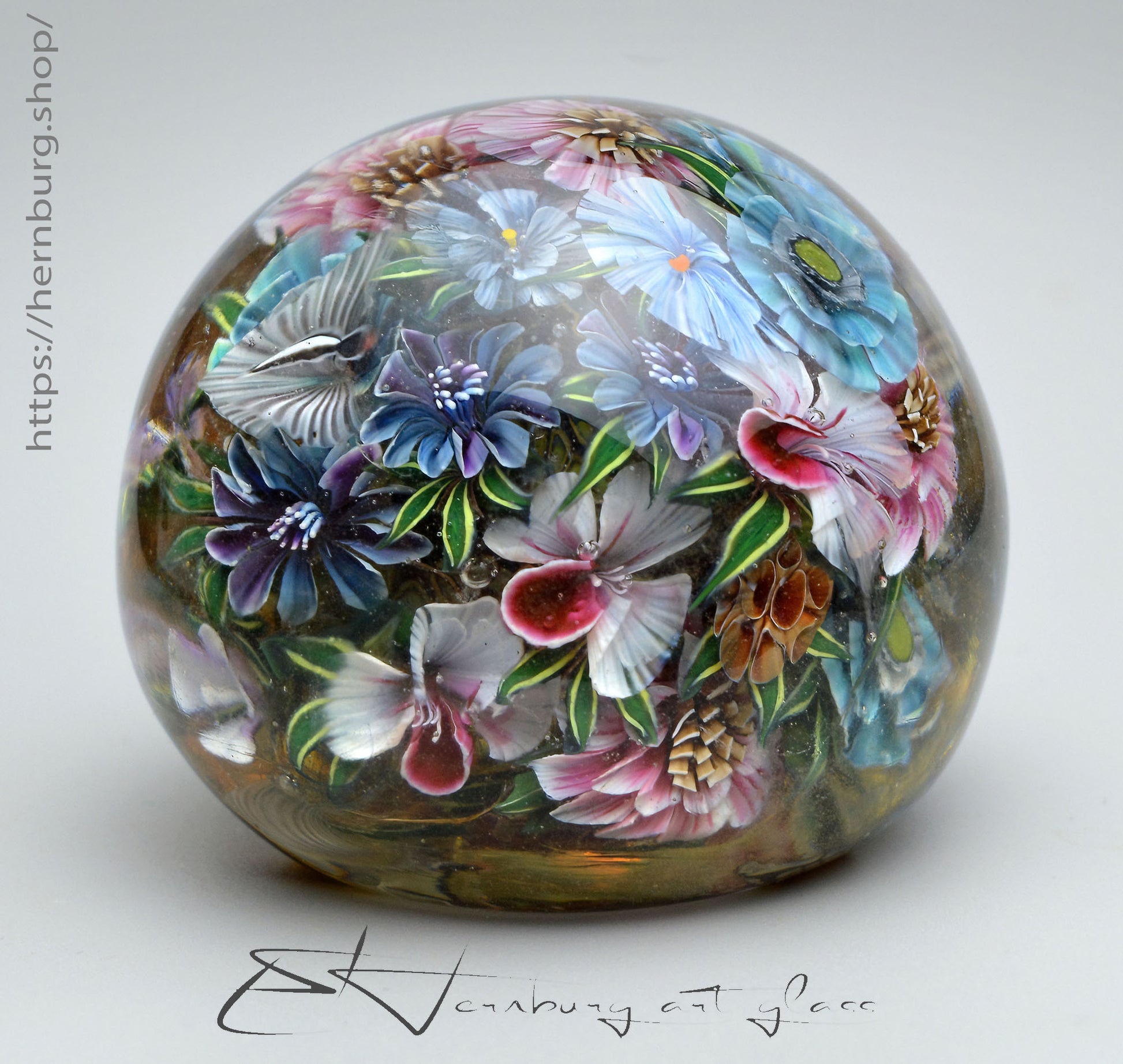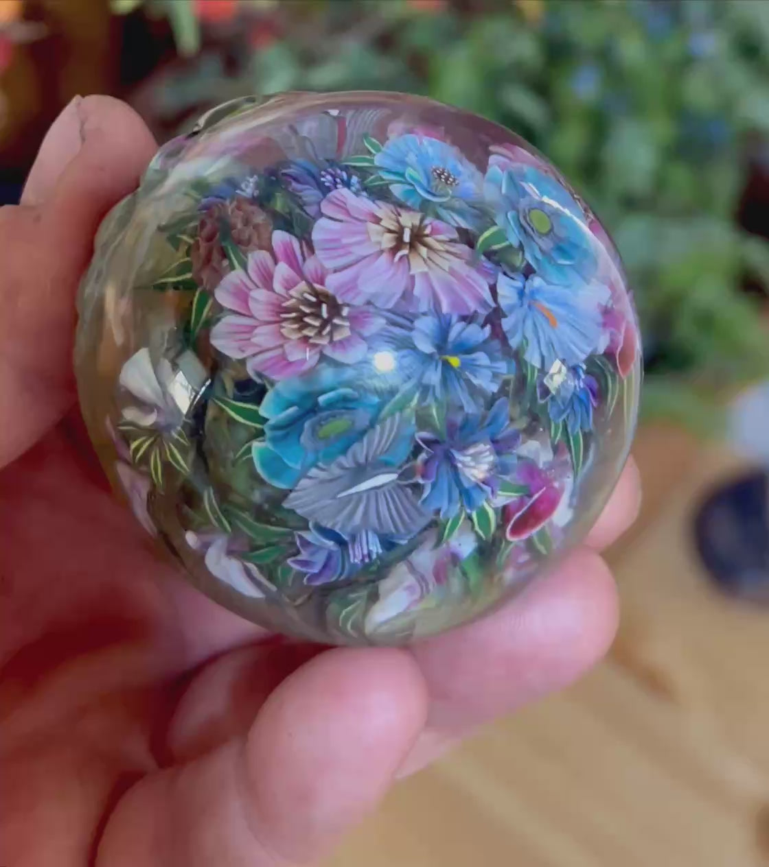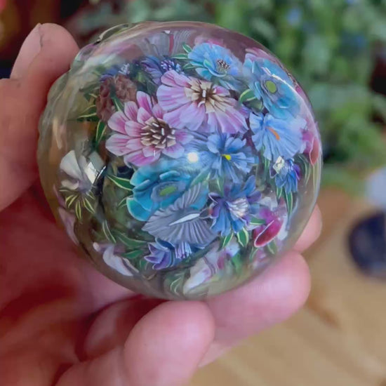 This paperweight was created in an irregular freeform shape — a true one-of-a-kind. Inside lies a morning garden: white birds soaring among pink and blue petals, with the lens effect enhancing depth and reflections, bringing every detail vividly to life.